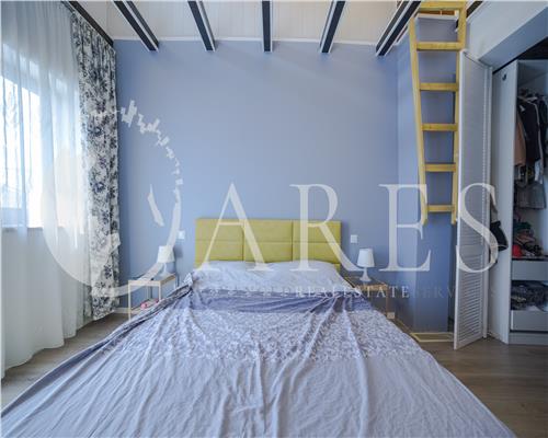 Scara iluminată LED te va purta la etaj, către dormitorul matrimonial care include și un loc de depozitare sub formă de atic. În plus, fiecare dormitor are dressing.